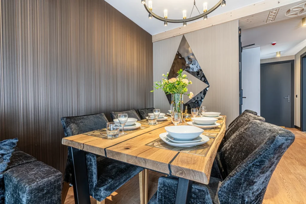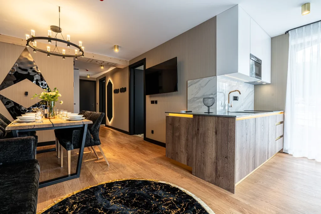 • Rodzinna przestrzeń w górach? Apartament rodzinny, to funkcjonalne wnętrze, dla całej rodziny. Luksusowa strefa dzienna, z aneksem kuchennym, oraz przytulną sypialnią, tworzą przyjazne miejsce do relaksu w górach. Znajdziesz w nim: wysokiej klasy sprzęt AGD, balkon, z widokiem na zieleń oraz łazienkę z prysznicem, mięciutkimi ręcznikami i suszarką.